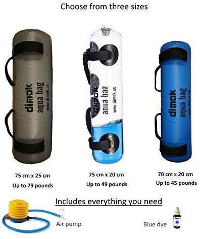 PORTABLE - Compact and light, weighing only 2 lb when empty, Dimok aqua bags are easy to transport and prepare for exercise. Just find water, fill, pump and start rocking it - the fuller it is, the heavier and more stable it becomes. Less water makes it lighter but more unstable. Foot Pump and Blue Die included! When full weighs up to 49 lbs!