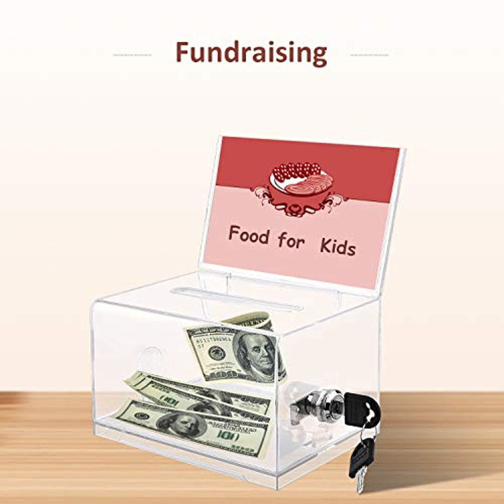 • ACRYLIC DONATION BOX WITH LOCK AND MESSAGE DISPLAY: SBB-66 is another useful office accessory from Clear-Ad. It is a clear standing donation box similar to donation jar that can be used as a money collection box. These plexiglass donation boxes for fundraising and charities are lockable and come with a 8.5x11" message display stand and a lock with keys.