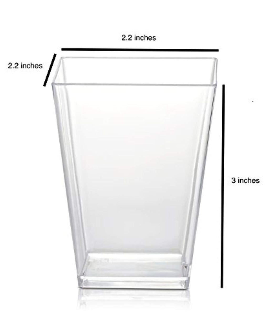 - CUPS AND SPOONS: These 5.4 oz cups and spoons are the perfect size for serving individual dessert portions, a taste of an appetizer, or hors d'oeuvres. Each cup is 3 inches tall and 2.2 inches wide and long at the top of the cup. 50 square plastic cups and 50 plastic spoons included.