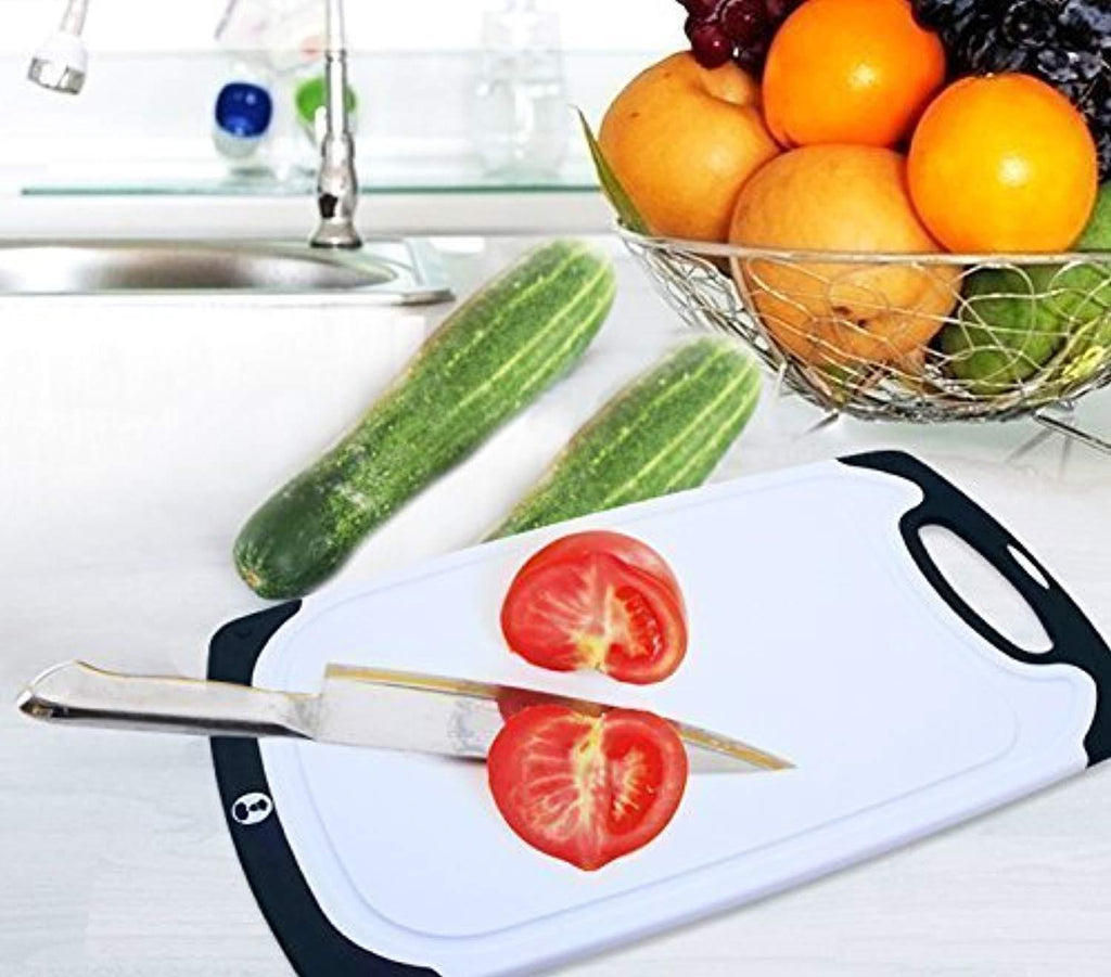 - Design features include a deep juice groove on one side and flat surface on the other side with non-slip edges made of thermal plastic rubber for easy handling and reduce board movement on kitchen work surface