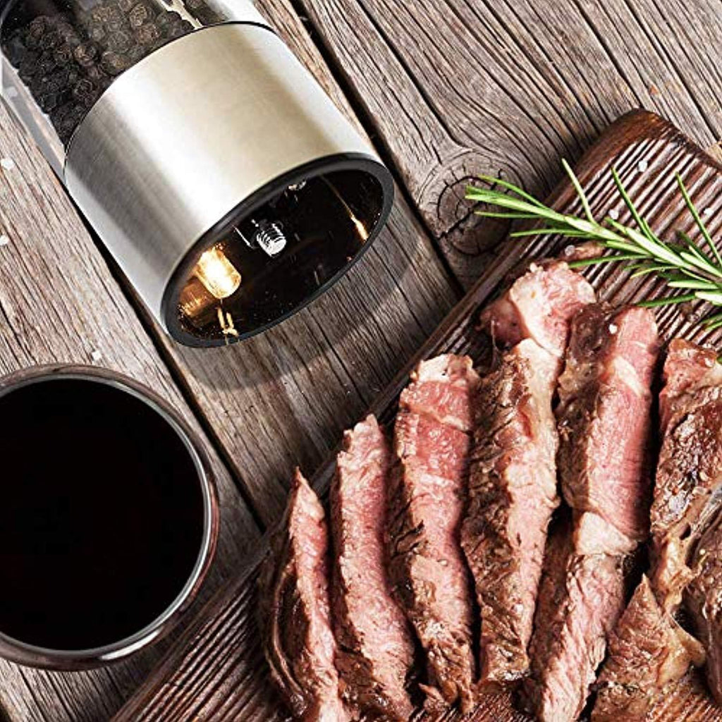 - 💡LED LIGHT and COVER: Automatic light is illuminated when the button is pushed to begin grinding your spices; No longer worry about over or under seasoning your meals; Each mill includes a CAP at the bottom to ensure that your spices stay fresh and there is no mess to clean up