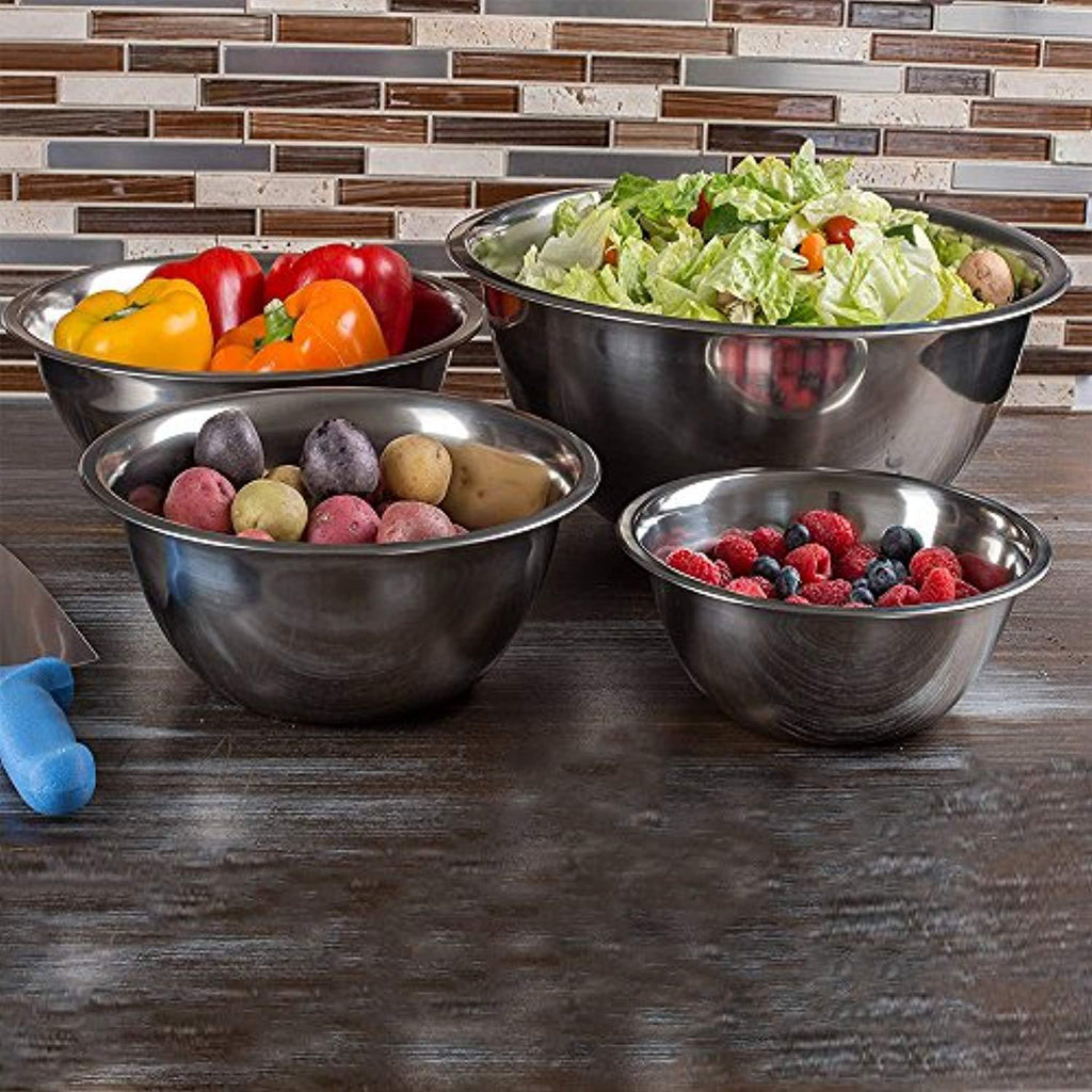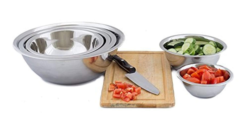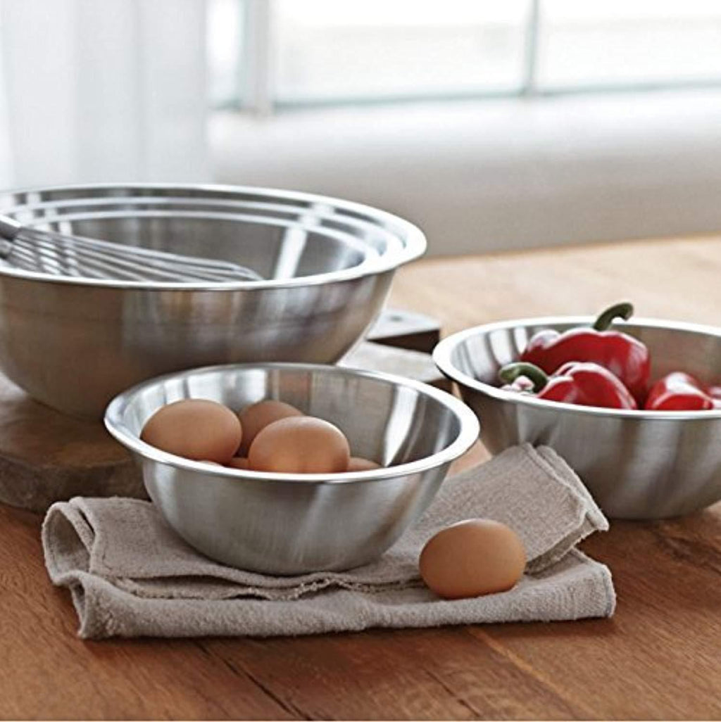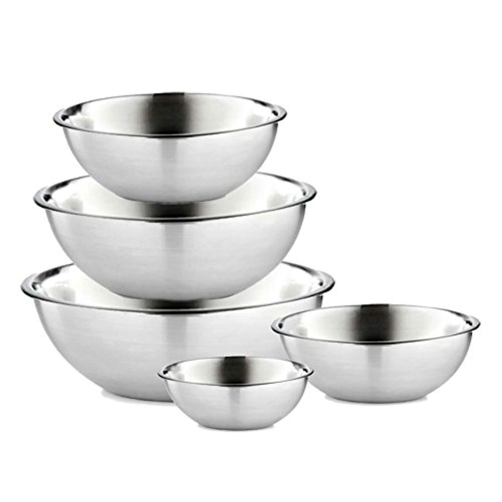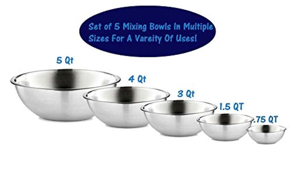 • Set of 5 premium quality stainless steel bowls. Graduating sizes of ¾, 1.5, 3, 4, and 5 quart stainless bowls allow for larger servings and less mess! The small metal bowls are great for whisking and beating smaller quantities, while the large metal bowls are ideal for mixing large batters, tossing salads, marinating and storing