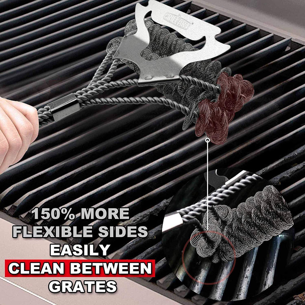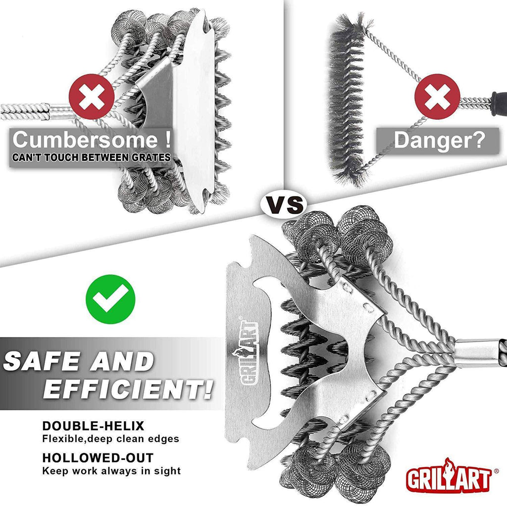 ✅【Faster Cleaning – A Hollowed-Out Scraper And 150% More Flexible Helix】: Wider scraper can effortlessly clean a larger area of stubborn stains; Hollowed-out design allows you to target the parts that have not been cleaned and tackle it directly; 150% more flexible shorter sides can be used to easily penetrate and clean between the slats of your grill. No more wasting time to force a too stiff helix to give in, leave you plenty of time to crack open a cold one and get back to the fun!