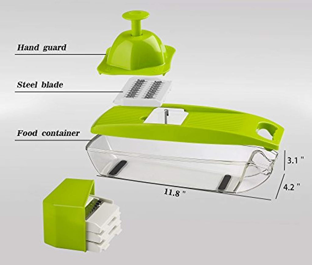 【TOP QUAILITY MATERIAL】Durable, sharp and high grade stainless steel blades,100% BPA FREE ABS & PP Plastic. The handle on top will allow secure holding while you are slicing, and the non-stick rubber base will increase the stability