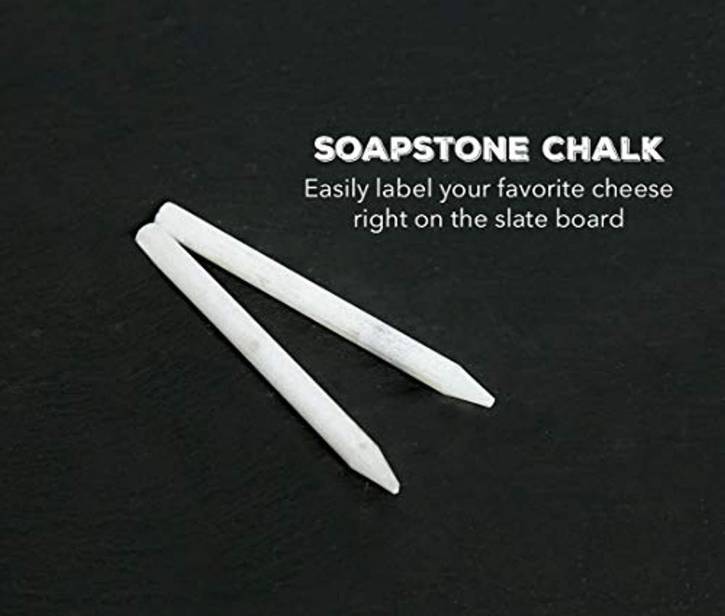 - INCLUDES 7 PIECES - Enjoy 1 premium slate board with stainless steel handles, 4 cheese knives, and 2 pieces soap stone chalk