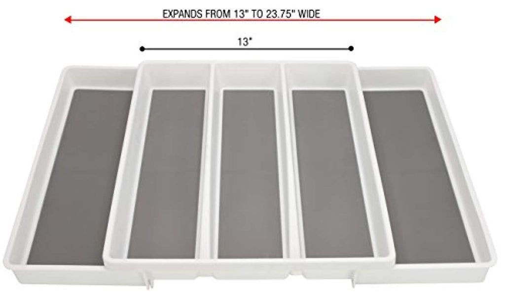 - EXPANDABLE & ADJUSTABLE — Expands from 13" to 23.75" wide — Organizers adjust to the width of your drawer for instant custom fit — Fits easily in most kitchen drawers