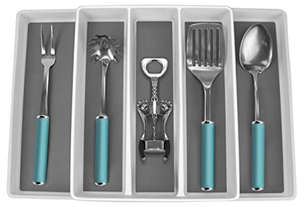 - UTENSIL FLATWARE DRAWER ORGANIZER (5 Sections) — Keeps your cutlery neatly arranged for storage and easy access within drawers— Features 5 sections, ideal for silverware, serving utensils, and various kitchen gadgets