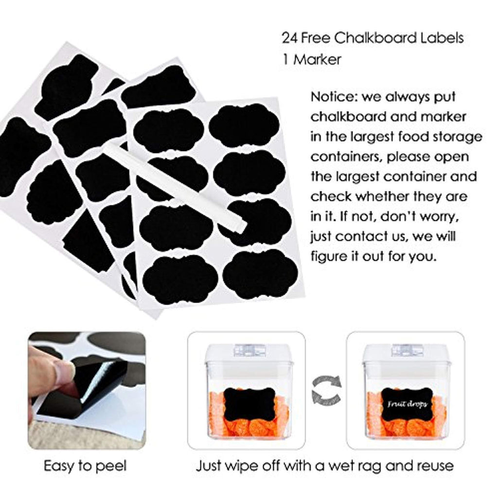 - 24 Free Chalkboard Labels and 1 Marker----Except 7 cereal storage containers, you will also receive 24 pieces labels and 1 marker, which will help you never confuse flour with powdered sugar or baking powder with baking soda. They are reusable, you can switch contents whenever you need. Just wipe clean with a damp cloth to change what you have written, Peel and Re-stick.