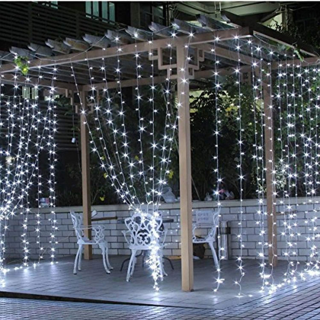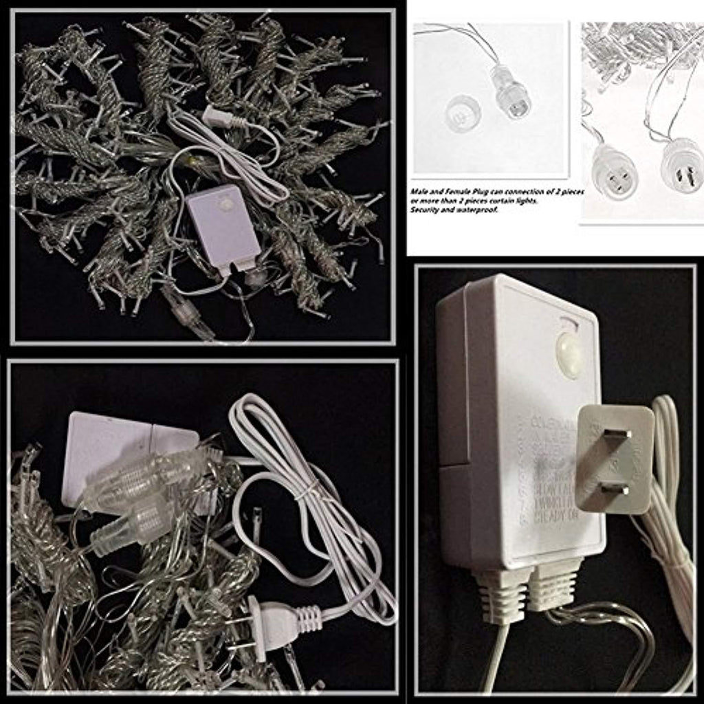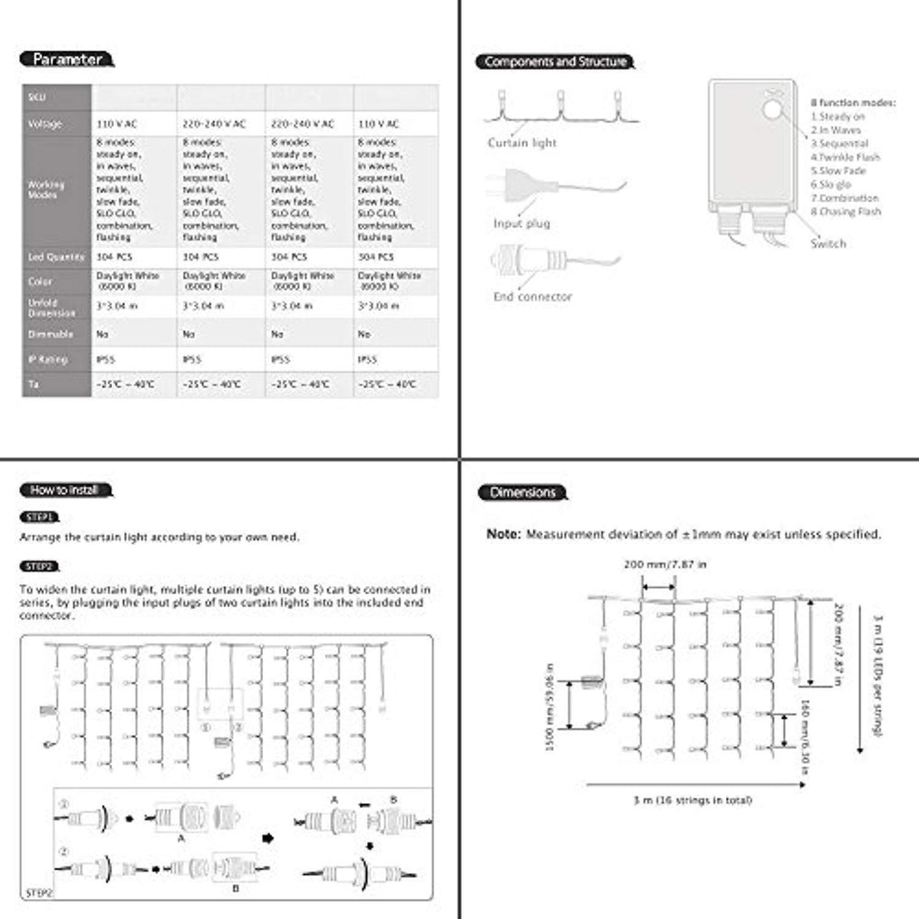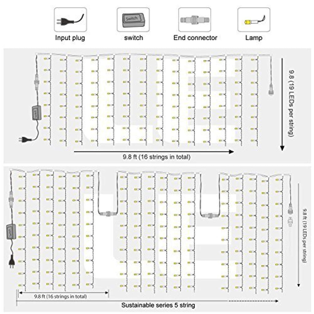 - 8 MODES TO CHOOSE: The lights have 8 different light patterns: Combination, In Waves, Sequential, Slo-glo, Chasing/Flash, Slow Fade, Twinkle/Flash, and Steady On. Different lighting effects are controlled by only one button.Size: 3M(W) x 3M(H),Strand of 304 LEDs