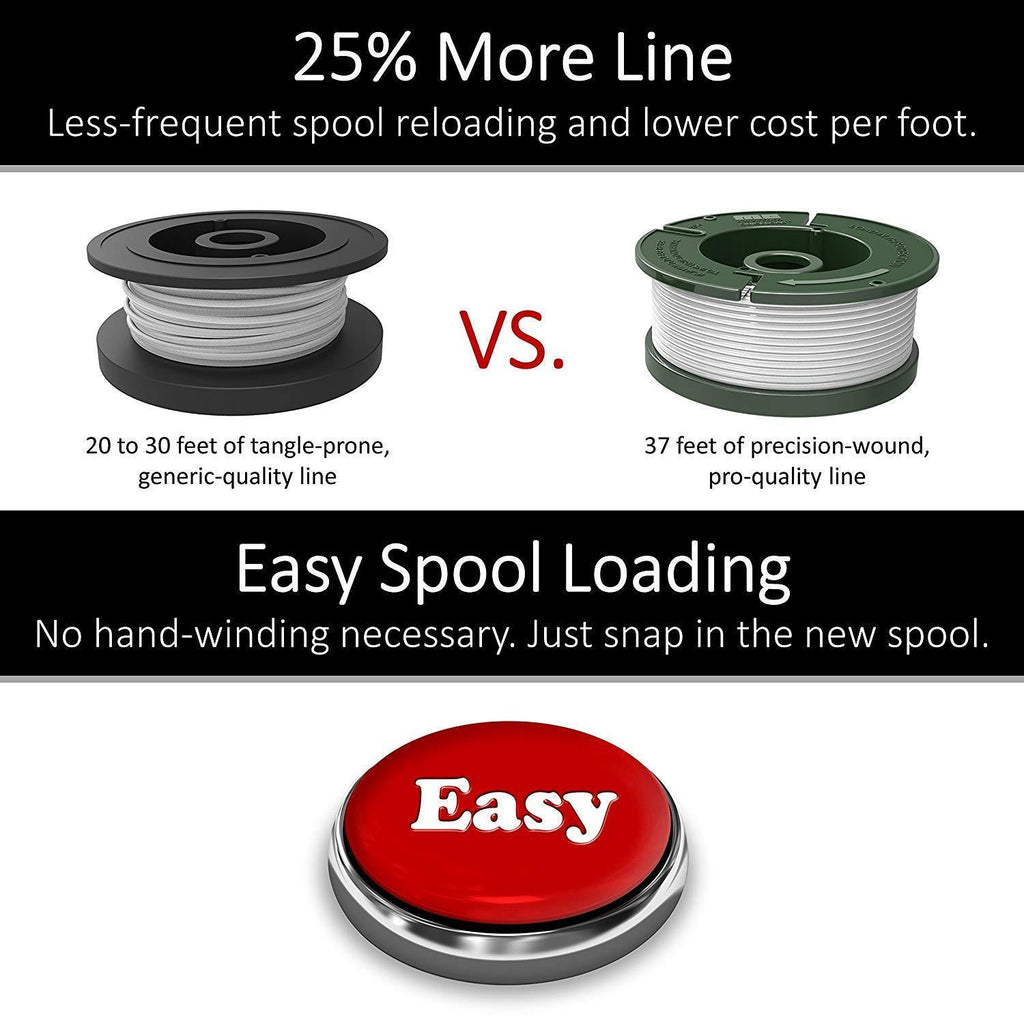 25% MORE LINE - Each spool includes 37 feet of line, which is about 25% more line than other spools. More line means less frequent spool reloading and a lower cost per foot of line. EASY SPOOL LOADING - Quickload(TM) for fast and easy spool replacement. No hand-winding necessary. Just snap the new spool of factory-wound line into place.
