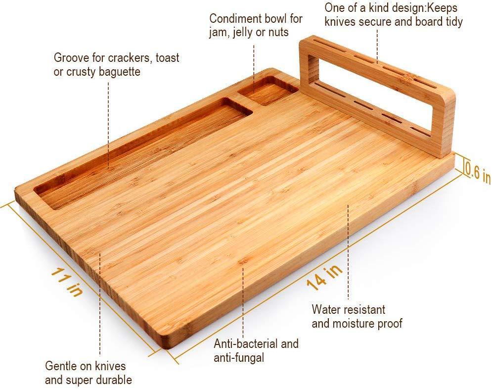 • Innovative & Rational Design: Cheese board is used to serve cheese, appetizers, hors d'oeuvres, charcuterie (cured meats),crackers and nuts and other snacks.The groove is ideal for crackers, toast or crusty baguette and the ceramic bowl placement point is perfect for bowl with jam,nuts or dipping sauce.The unique vertical knife block will keep your cheese knives organized and display their true beauty.The size is (14” L X 11” W X 0.6” H) and weight is (2.3Ib).