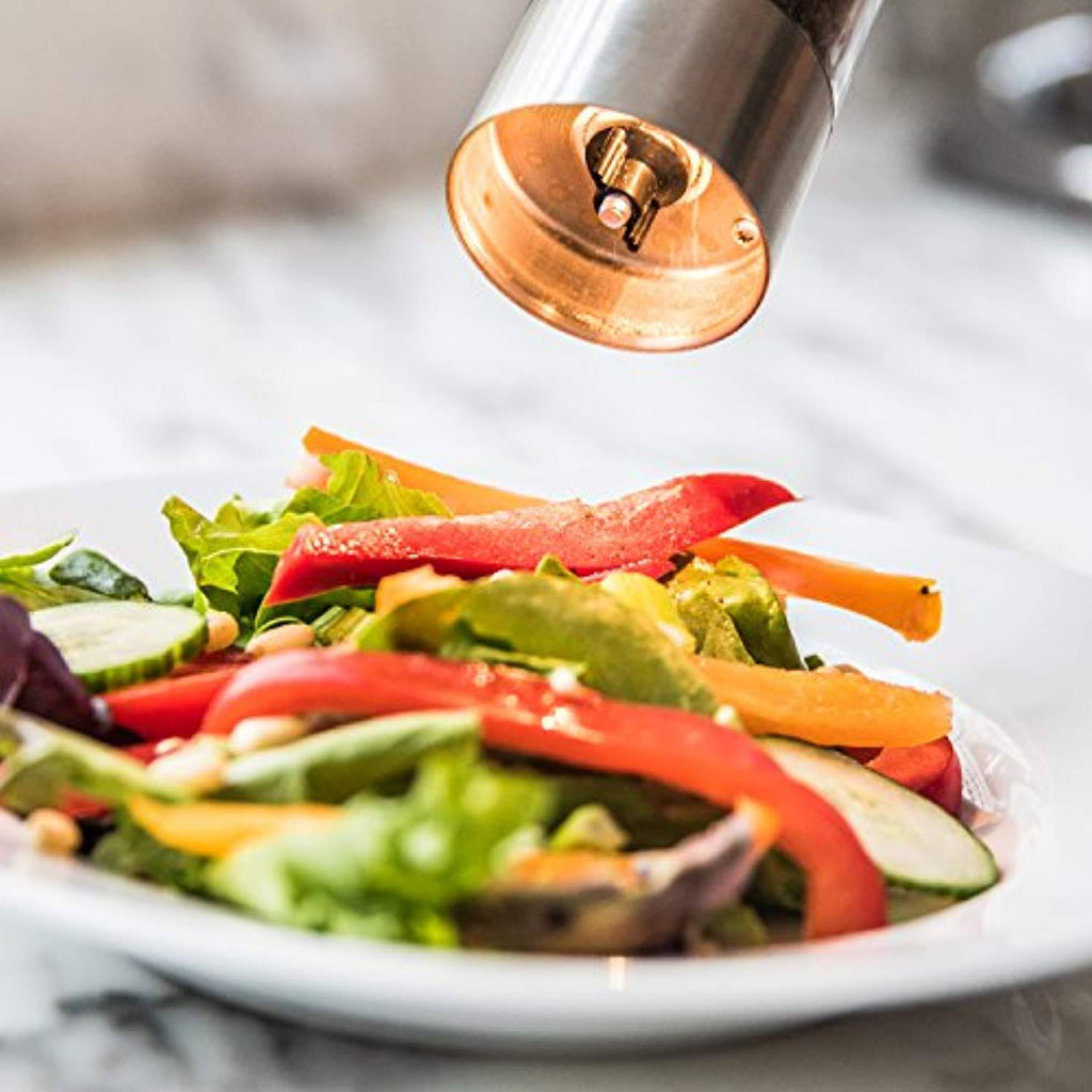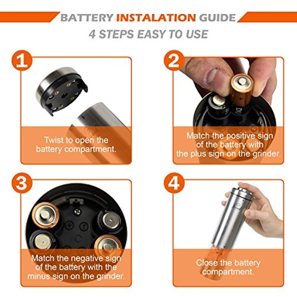 • 👍EASY TO USE: the rubber caps are easy to attach and keep your table clean; their innovative design keeps them in place and prevents them from falling; easy one hand operation contributes to the optimal performance of the grinder; the automatic mills need 4AA non-rechargeable batteries each, the modern design of the stainless steel salt and pepper grinders allows easy hustle-free replacement of the batteries and the refilling of the condiments