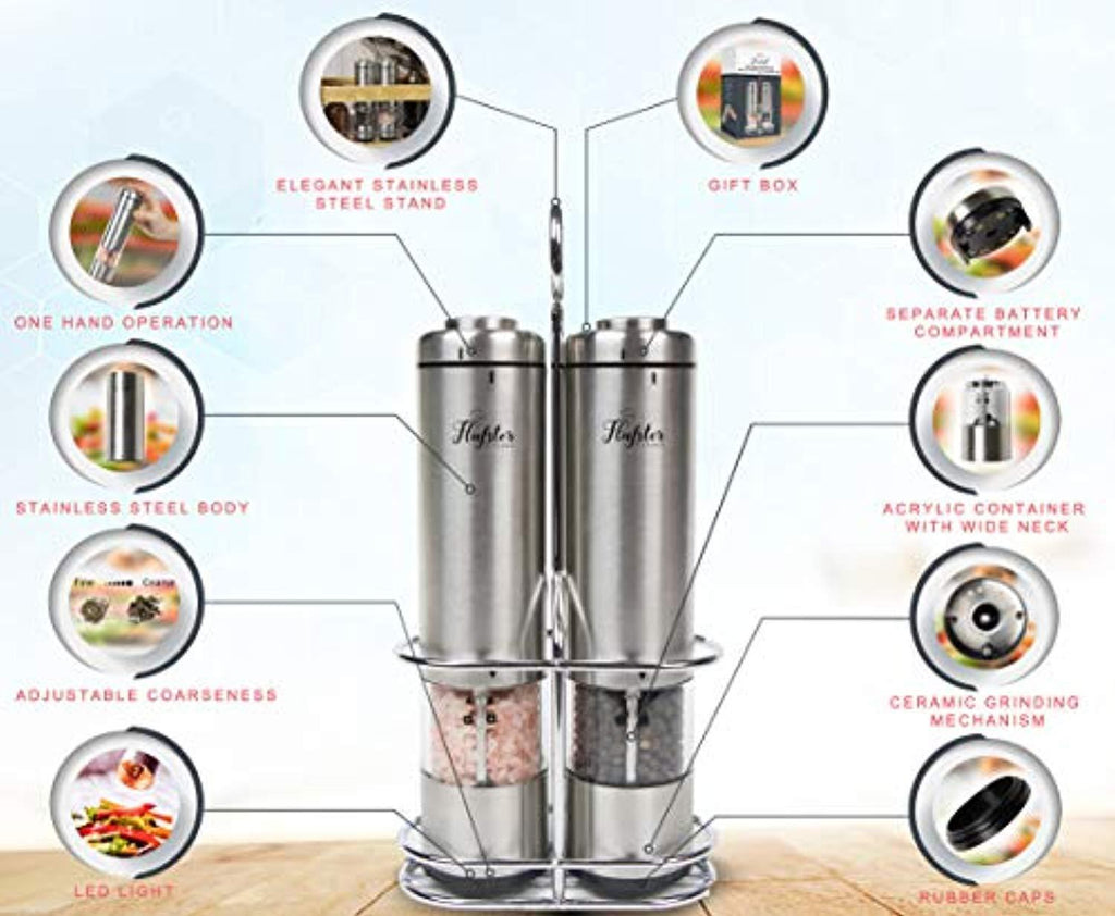 • ✔️QUALITY: For the Electric Salt and Pepper Grinder Set Flafster Kitchen (Previously known as Jovial Kitchen) has used the highest quality stainless steel to meet the highest quality standards and make your kitchen look sleek and stylish and ensure premium and unique experience;The electric pepper mills are a necessity for every home; The elegant design and gift box make these battery powered salt&pepper shakers the perfect present for any occasion