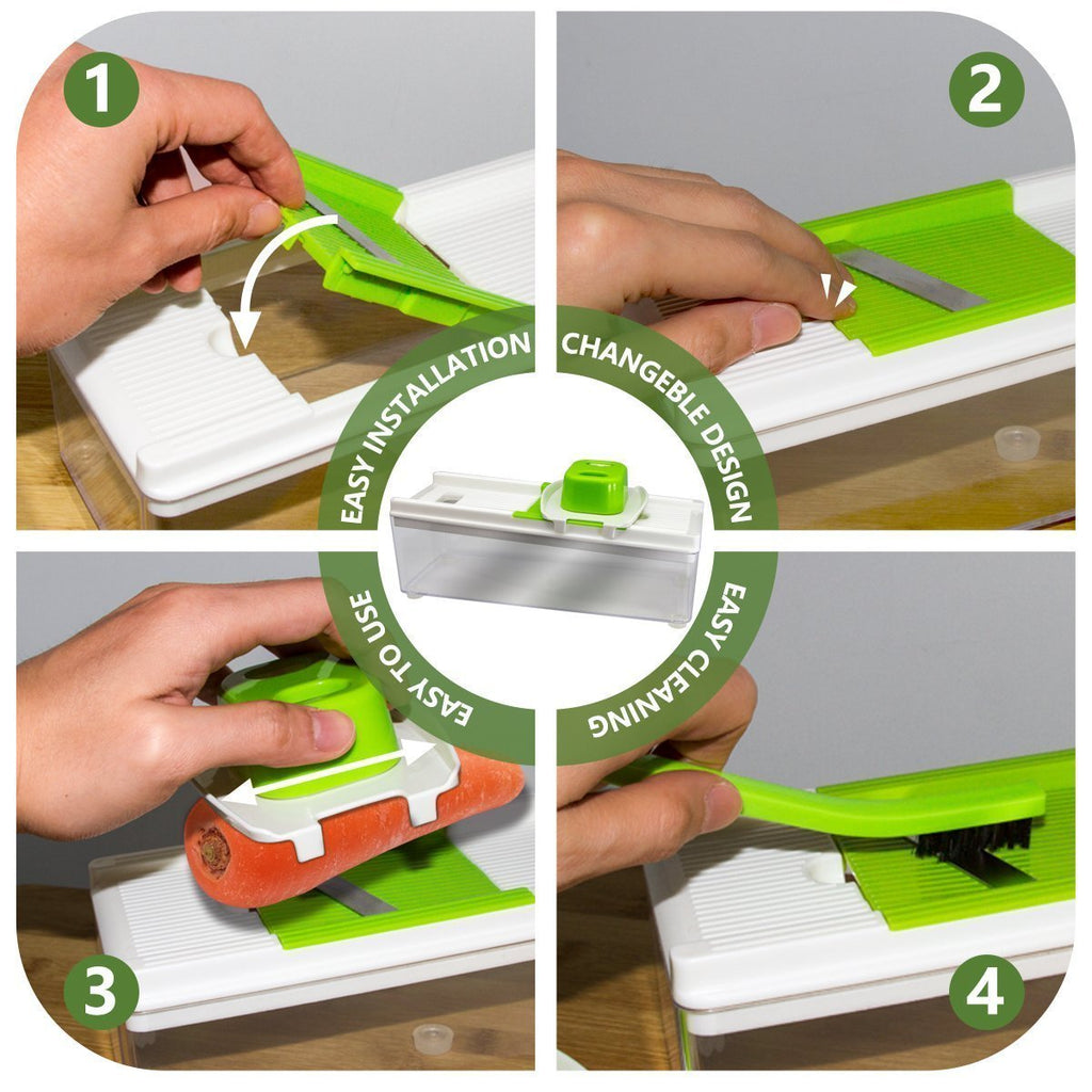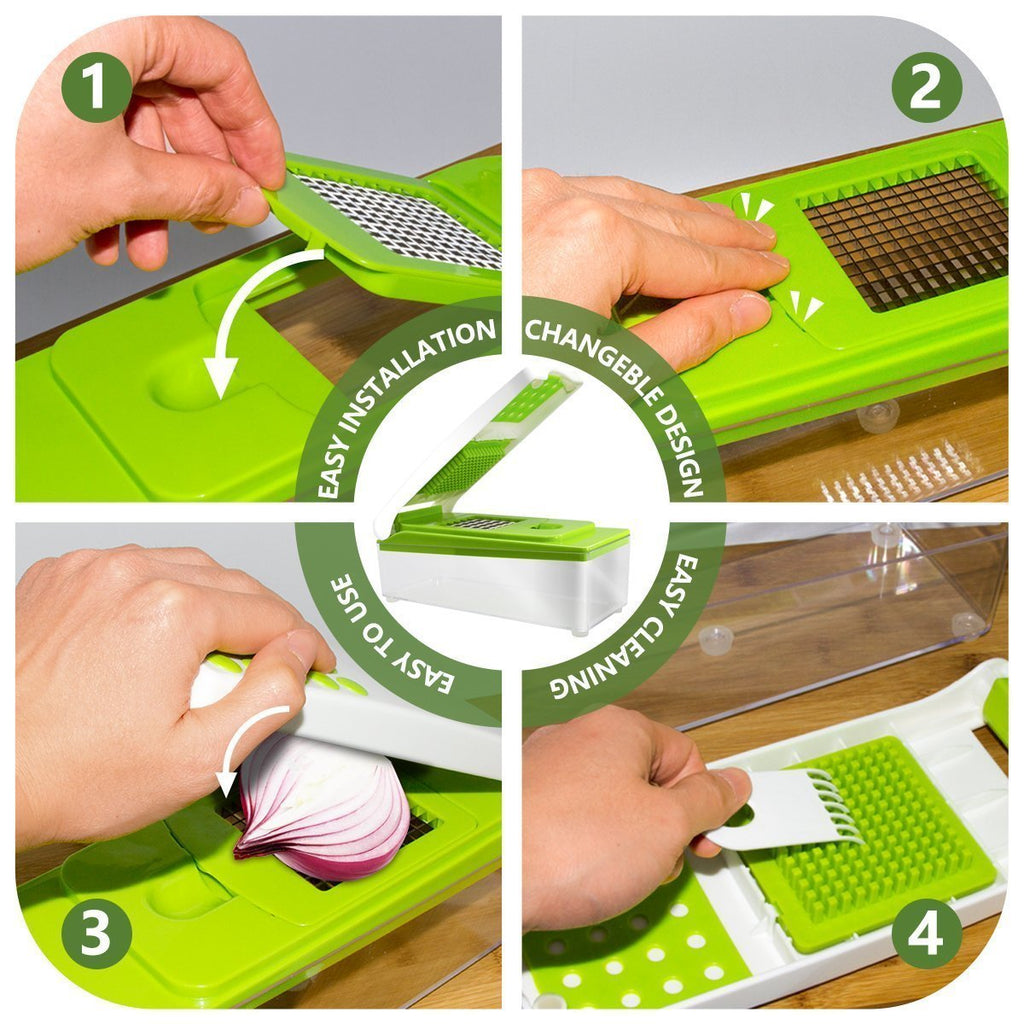 EFFICIENCY & EFFORTLESS - With the vegetable chocker, you have a kitchen helper that greatly shortens the time from the start of cooking preparation to the serving of the meal. It offers numerous cutting results: cubes, pens, slices, stripes, quarters and planed - all in one set! It's a great system for preparing salads, fruit and vegetable dishes and so on. Effortless, fast and completely without electricity.