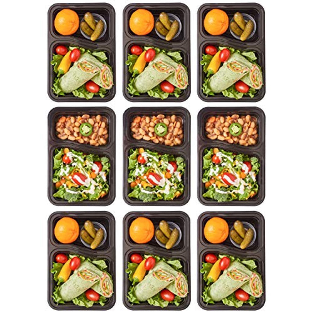 10 food containers and lids, 2 compartments each. Measurements: 8.75” long x 6” wide x 2” deep. Lightweight and stackable