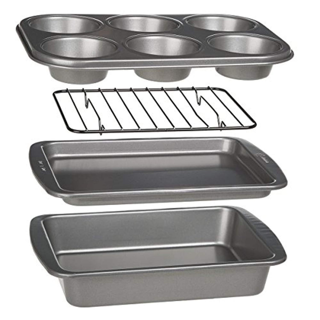 • SET INCLUDES – 8.5” x 6.5” Cake Pan, 8.5” x 6.5” Cookie Sheet, 10.25” x 7” 6-Cup Muffin Pan and 7.5” x 5.5” Cooling Rack
