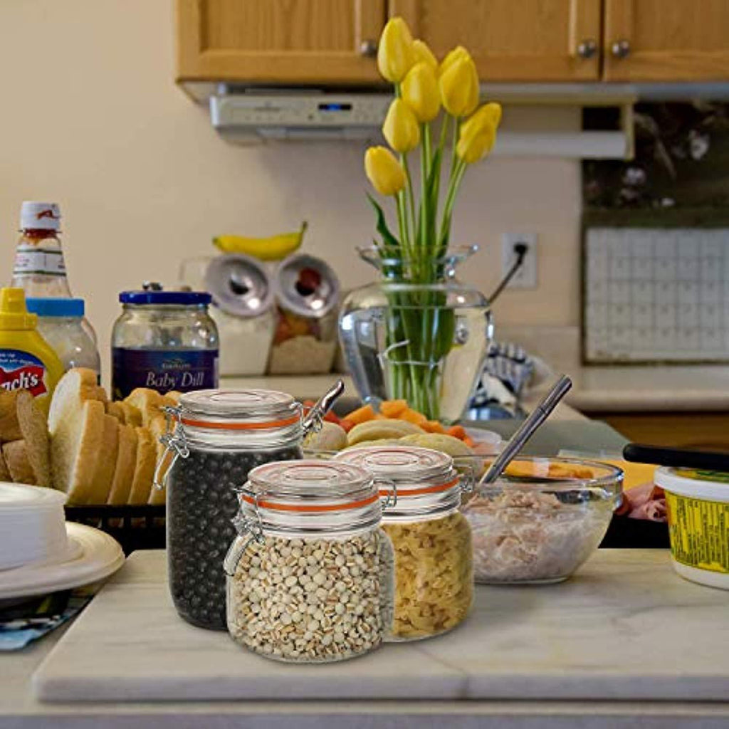 ❤EXCELLENT ORGANIZTION SET :These multipurpose,prefect size to be used as canisters,storage jars for home and kitchen ,ideal for pasta,coffee,beans,sugar,candy,cookies,snacks,rice,noodles,flour, spices, seeds, shells,bath salts, powder and much much more,also great for canning your own pickles and other canning foods!vingear proof make it wont get stain,elegant design make its being a excellent gift for sure too!