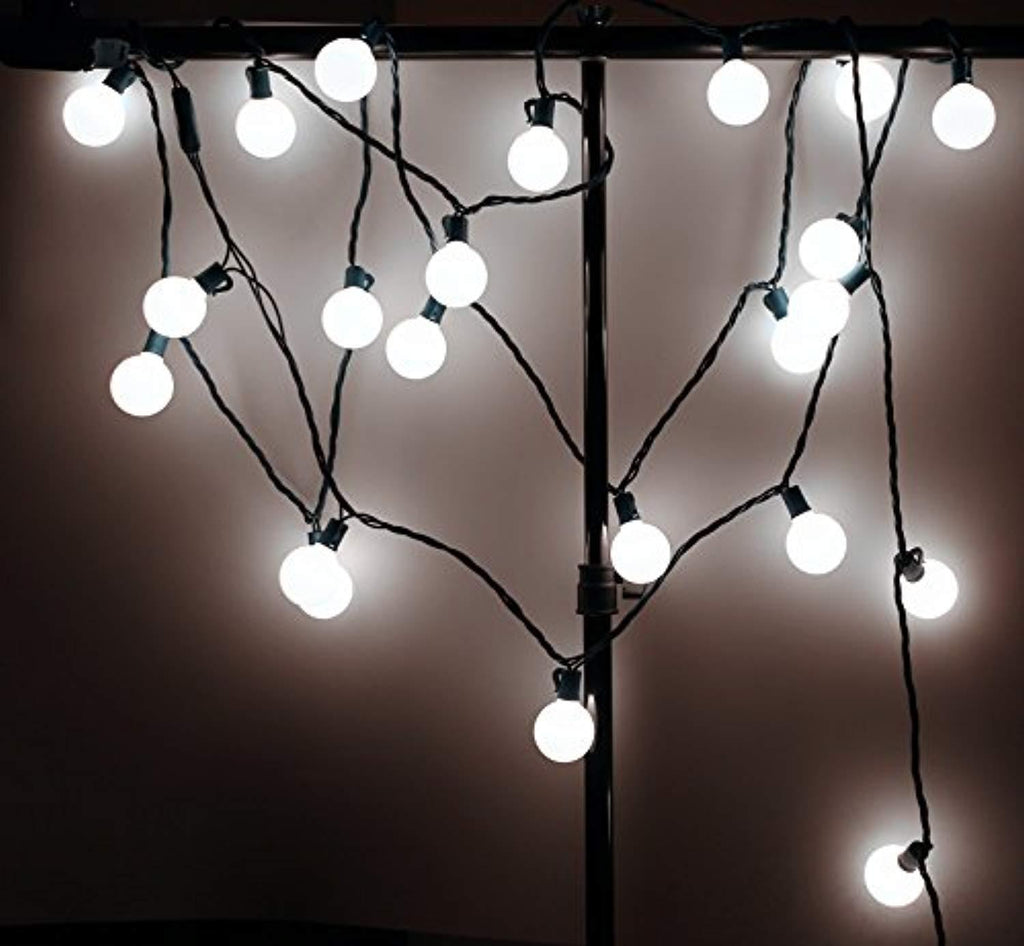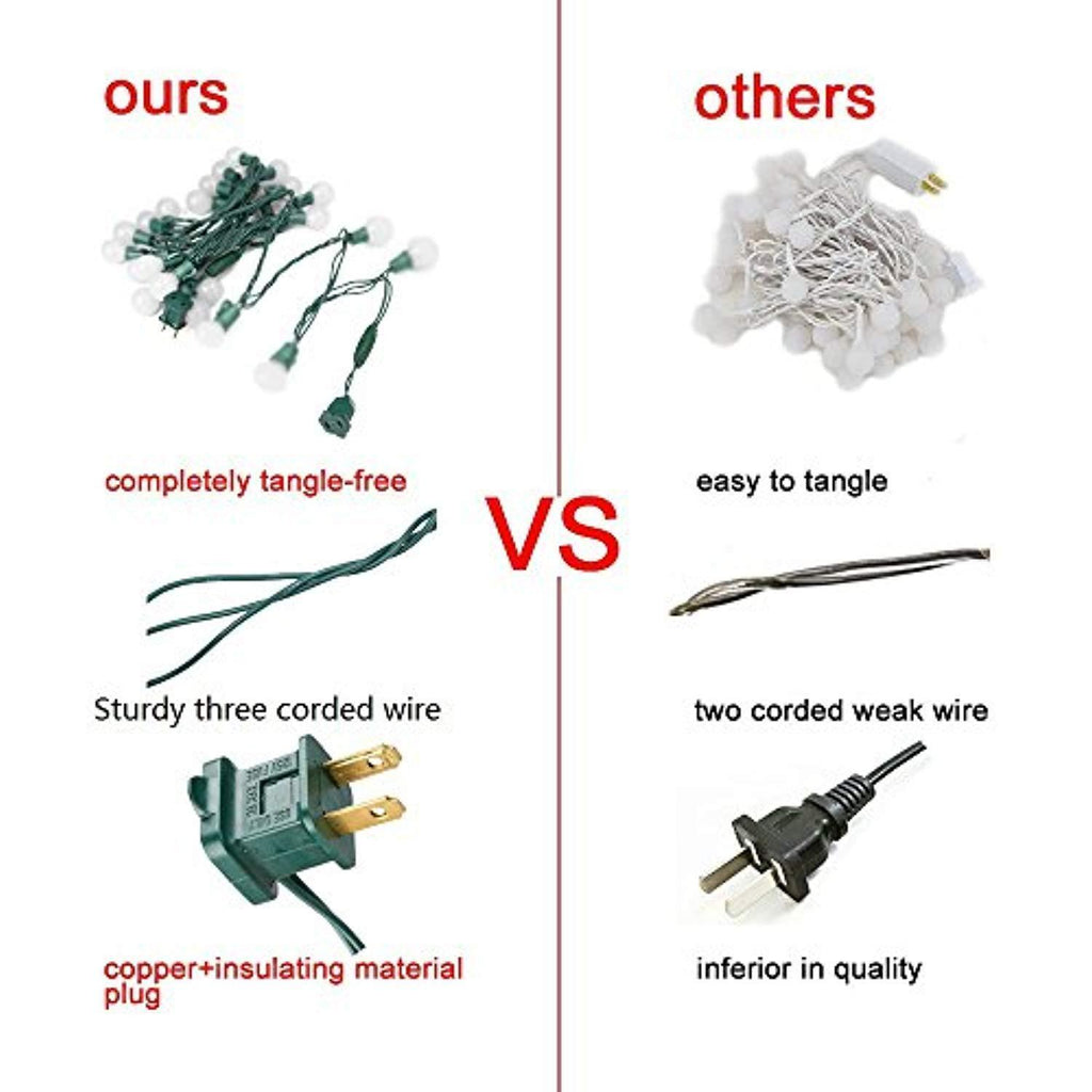 • Connective Lights Up to 40 Strands,Set of 25,Total Lenth-17Ft Green Wire,8" Spacing,G40 Globe Size-2 1/4" tall and 1 1/2" wide,Bulbs with hook design for convenient use,no need to buy other hook to set the strings.