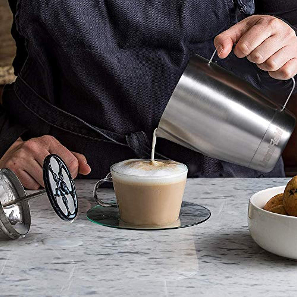 ⭐【1.1MM Thickness and 0.99LB Weight :】 About 50% thicker than most of other milk frother cups. And at lease 30% heavier than most 32oz capacity milk pitchers.