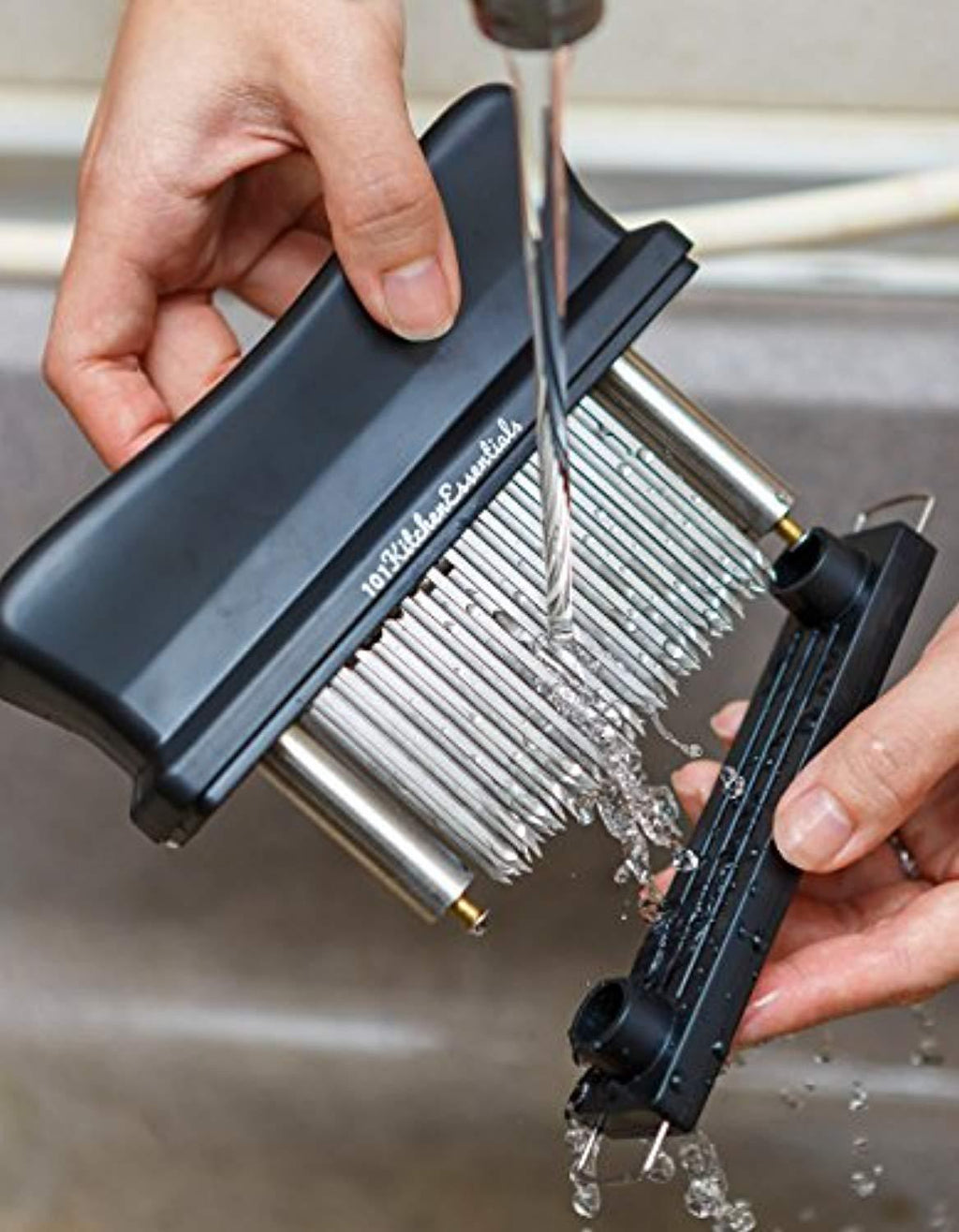 - 48 STAINLESS STEEL BLADES – 101KitchenEssential’s meat tenderizer helps to break down the meat’s connective tissues easily and quickly. This allows your meat to marinate faster, and reduces cooking time by up to 40%!