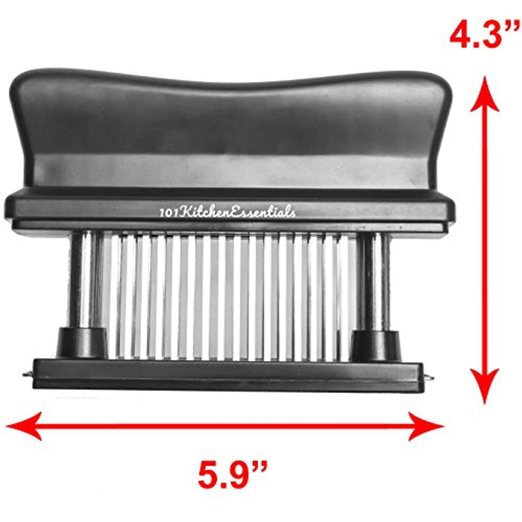 - DIMENSION OF MEAT TENDERIZER – Measuring 5.9” by 4.3”, this perfect size 48 blades meat tenderizer makes it easy and efficient to tenderize inexpensive meat cuts, ensuring that the cooked meat taste as good as any other cuts!