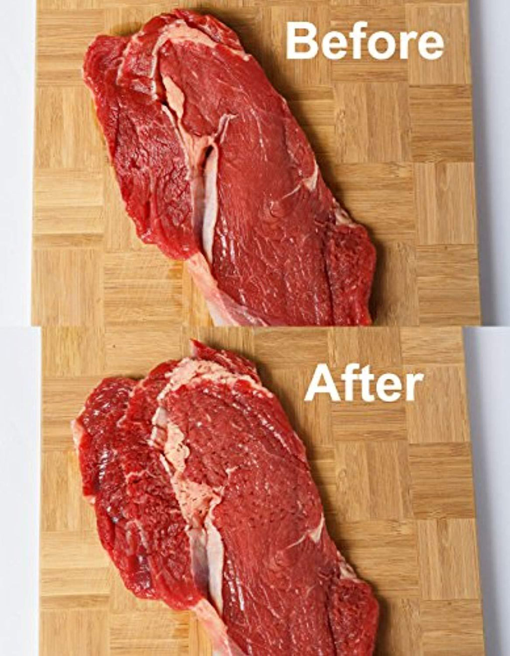 - SUITS A WIDE VARIETY OF RAW MEAT – This heavy-duty meat tenderizer can be used to tender white and red meats like Sirloin Steak, Rib Eye Steak, London broil, round roast, chicken breast, pork loin etc. Marinate your succulent meats faster with the meat tenderizer!