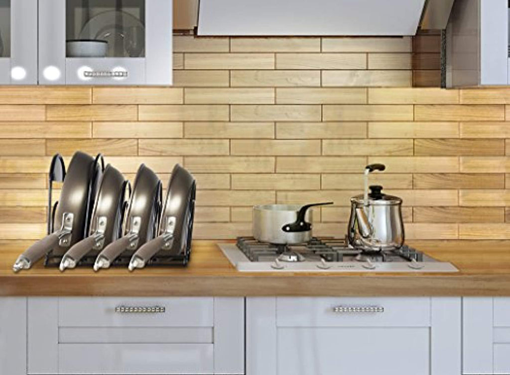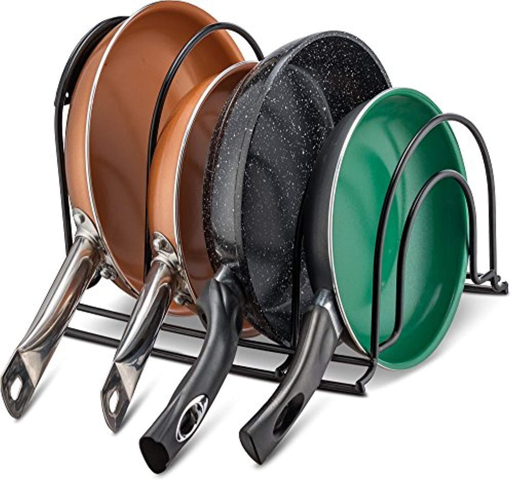 GENEROUS CAPACITY: This organizer rack features 5 “shelves,” enough to hold 2 14-inch pans and 3 9-inch pans, or 6 large lids and 2 pans. That will save loads of space!