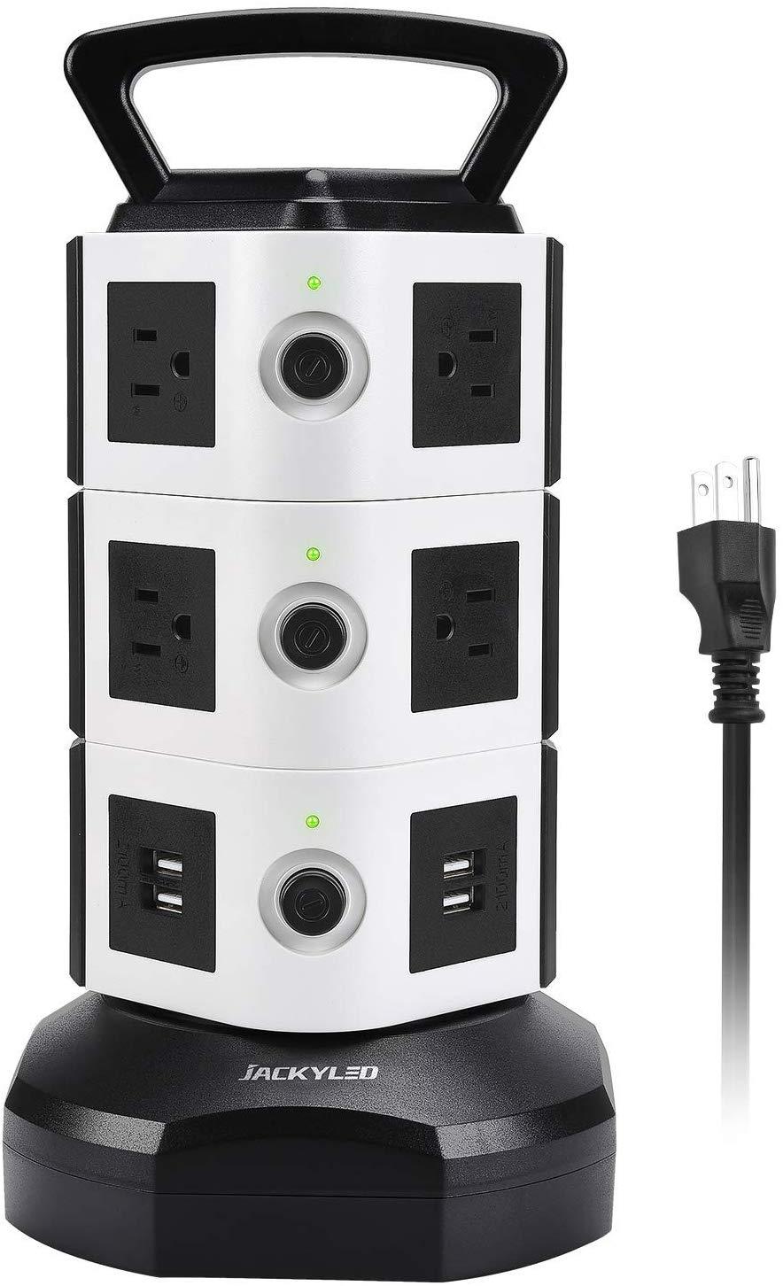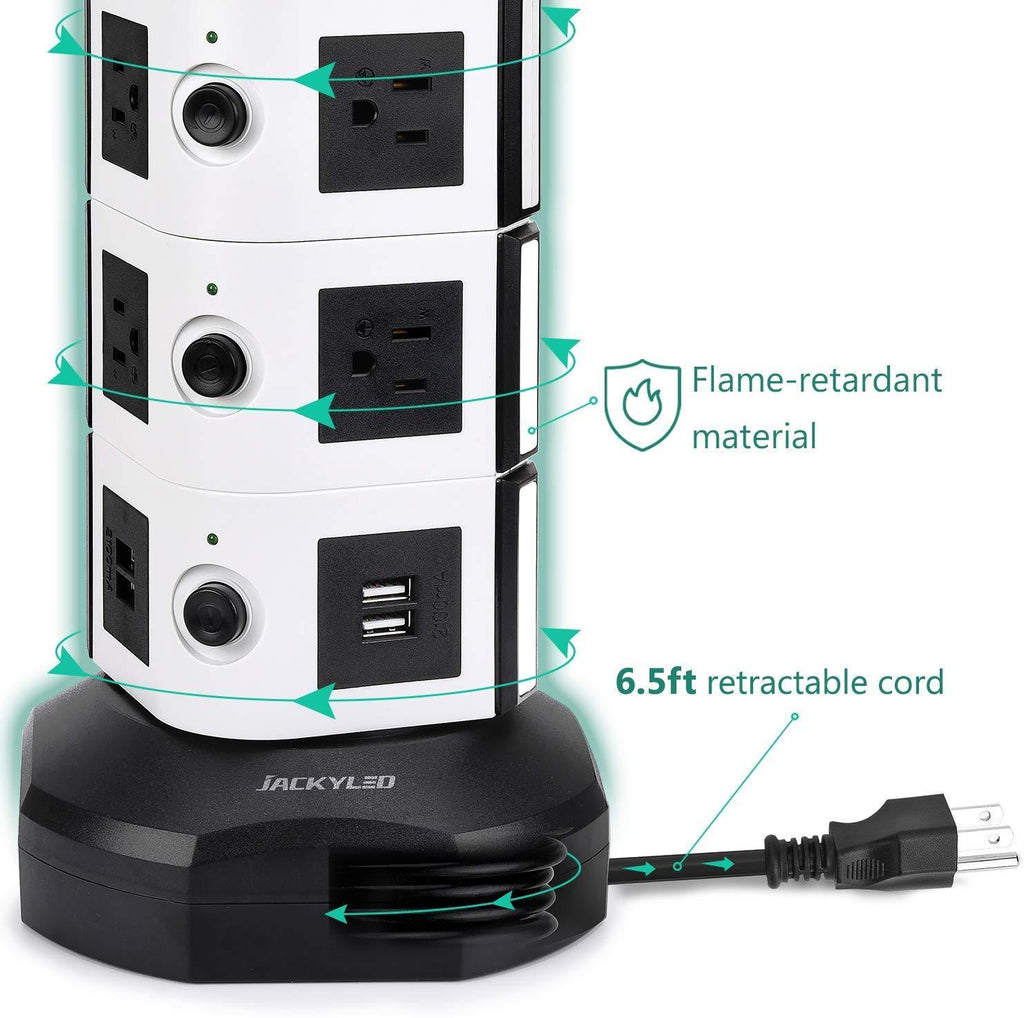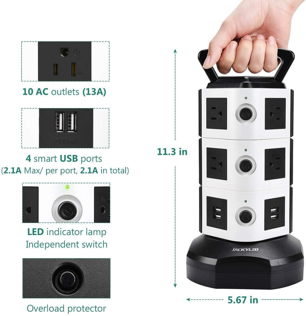 Power Strip Tower JACKYLED Surge Protector Electric Charging Station 3000W 13A 10 Outlets 4 USB Ports with 16AWG 6.5ft Heavy Duty Extension Cord Universal for Home Office
