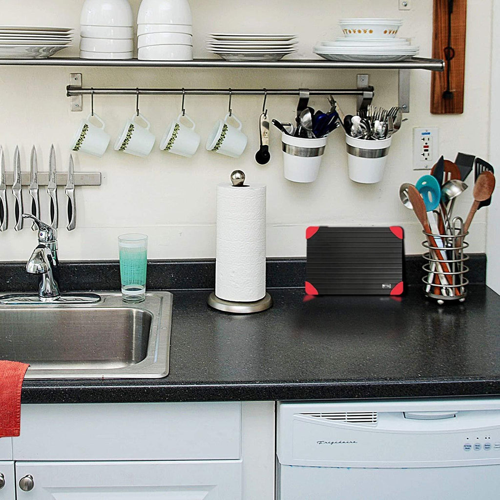 NATURAL THERMODYNAMICS – Our fast meat defrosting plate features HDF Aeronautical Aluminum Alloy which is scientifically proven to conduct cold away from frozen food and disperse it into the air. It also attracts surrounding heat through the process of thermal dynamics. This process accelerates the natural defrosting process and allows you to defrost frozen foods on your counter in a matter of minutes as opposed to hours.