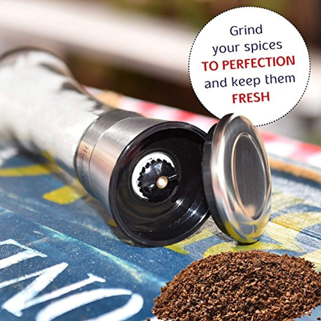 🥙🥩🥘 COOK LIKE PROFESSIONAL CHEF; These Salt Pepper Grinders are Manufactured with a super smooth easy grip stainless steel grinder lid that won't leave a messy powdery residue after use. Our kit of saltshaker and pepper mill comes with closed cover top lids. just put those side up on the counter table and keep dust out so YOUR SPICES STAY FRESH!
