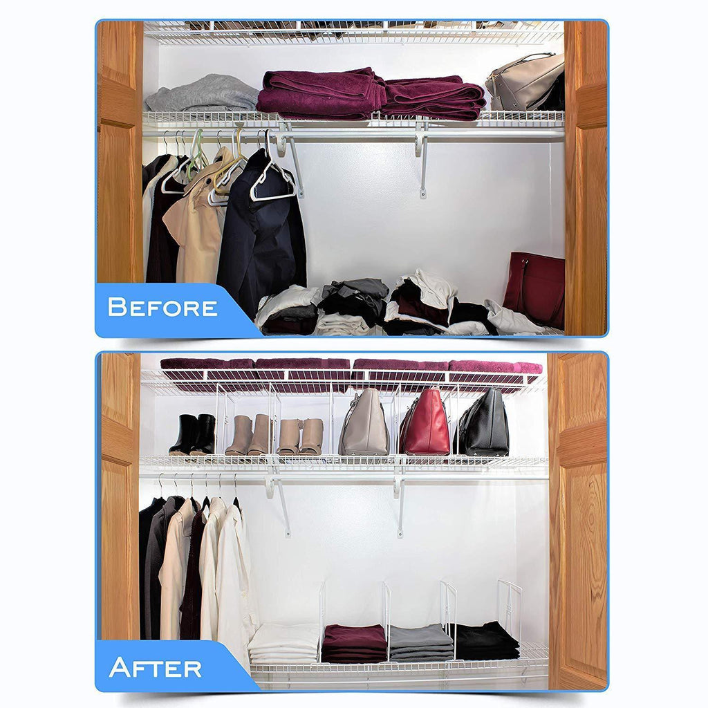 ✅ STRESS FREE SETUP ON EACH CLOSET SHELF ORGANIZER! - No tools, no wooden dowels. Simply grab, squeeze and release the closet shelf divider on to the wire shelves. Need more? Instruction is included! These dividers work ONLY with wire shelving, DOES NOT work with wooden shelves!