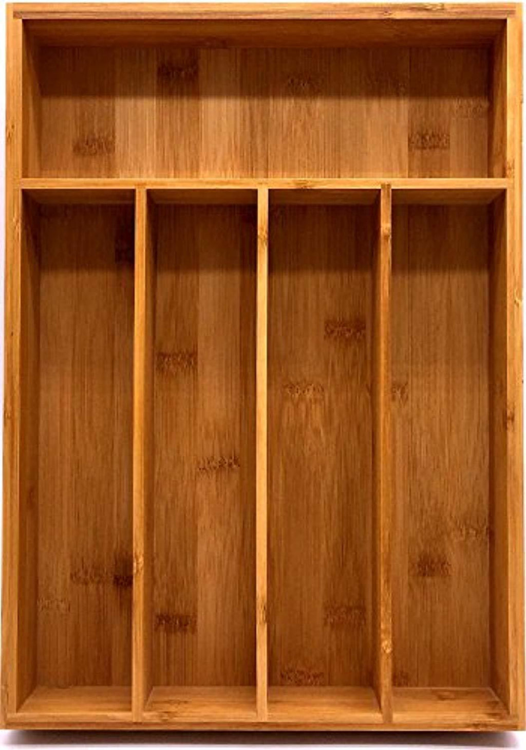 Made from eco-friendly bamboo, the tray features an ingenious design to help you organize your flatware, cutlery and kitchen gadgets without creating a mess in the drawer